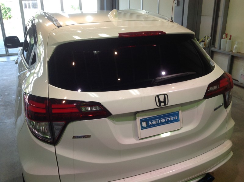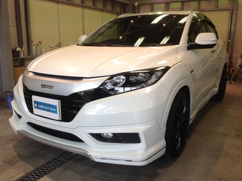 以前GSコーティング(http://www.meisterinc.co.jp/topics/559)を施工した、無限エアロの「ヴェゼルHV」。今回はカーフィルムを貼りました。