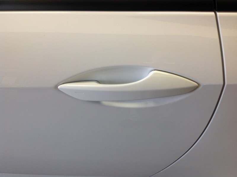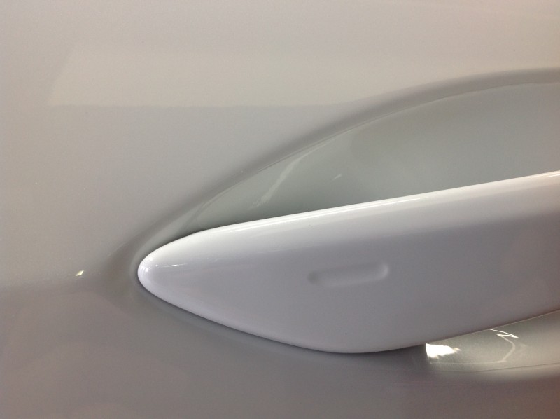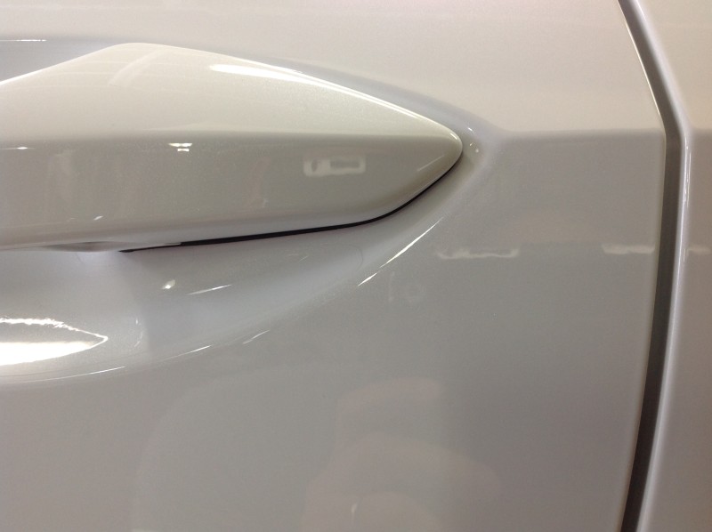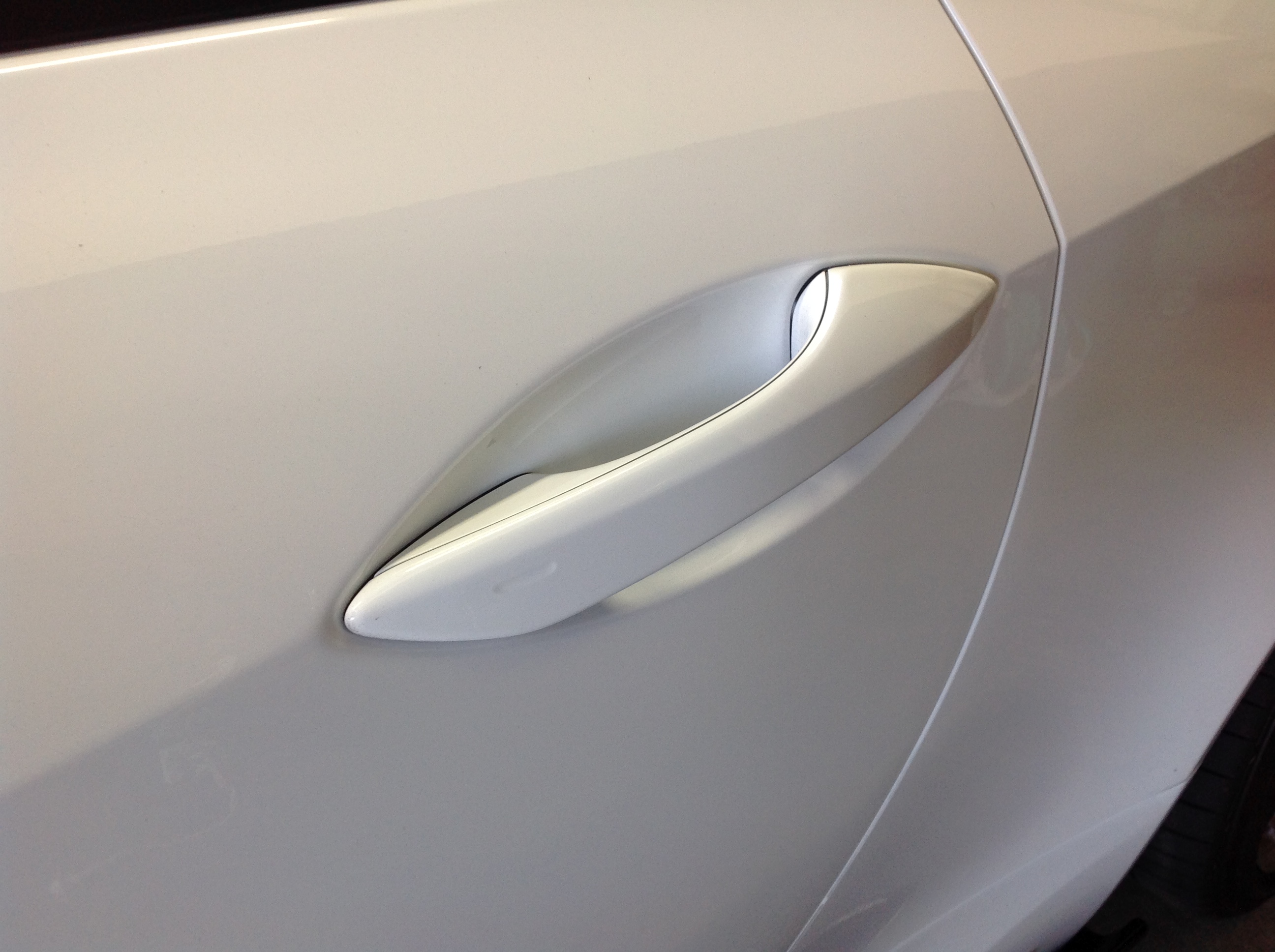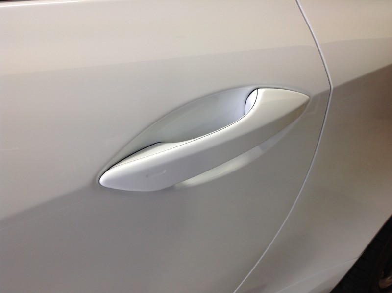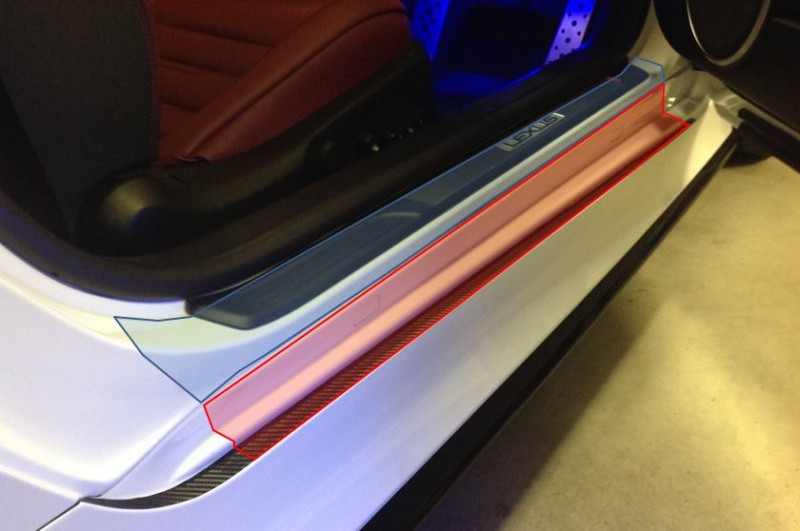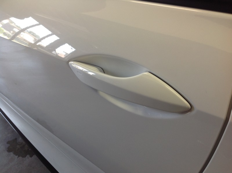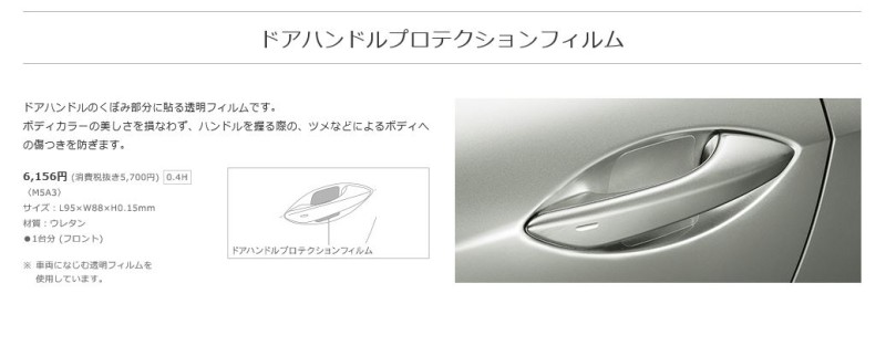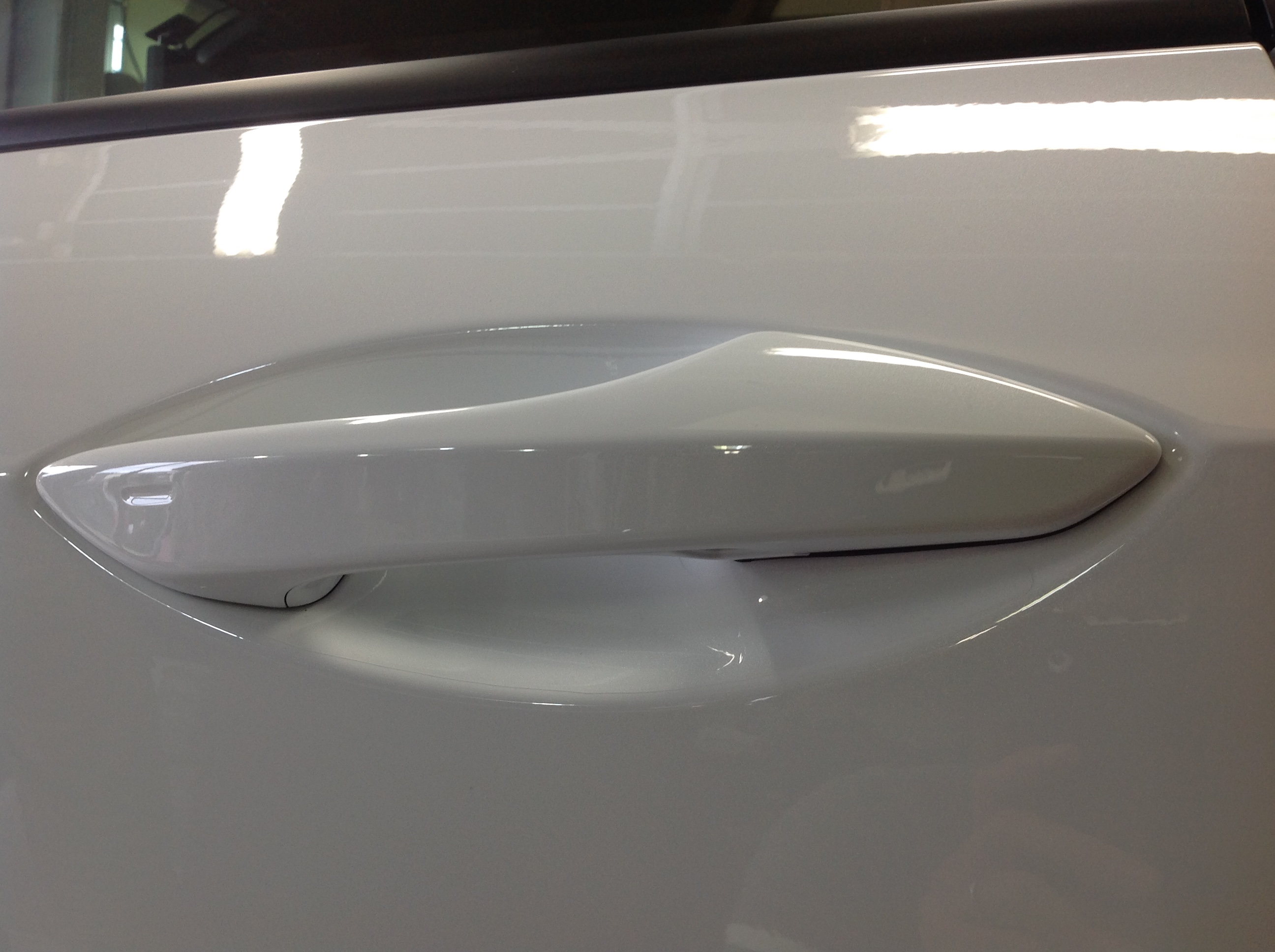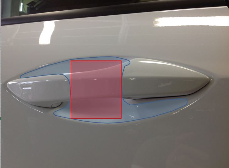まず定番のドアカップ。ドアを開ける際にツメを引っ掻けやすい部分なので、プロテクションフィルムで保護。ちょっと純正オプションのプロテクションフィルムと比較してみました。青が弊社の施工範囲ですがドアカップ全体をカバーできてます♪