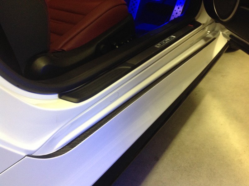 ステップも乗降時に靴で擦りキズが付きやすい部分です。ココは汚れでプロテクションフィルムのキワが目立たないように上からカーボンのラッピングフィルムを貼りました。見えにくいですが、色が付いている範囲にプロテクションが貼ってあるんですよ!