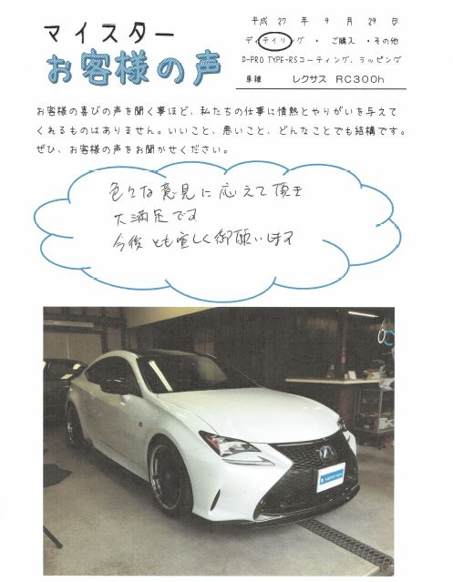 先週からご紹介していた、レクサス「RC300h」のコーティング~ラッピングが完了し、ディテイリング一式終了したので全貌を公開です。