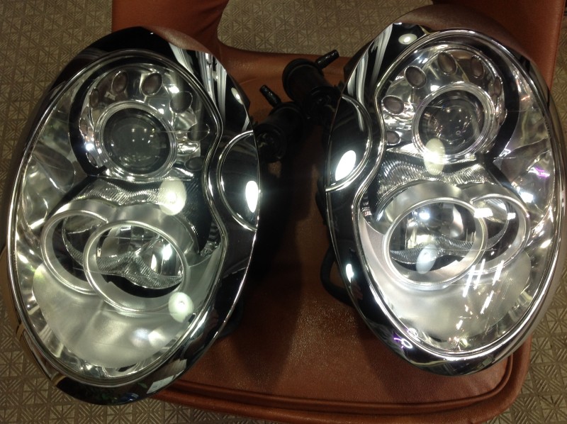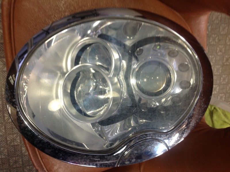 まず曇っている表層を磨き落とします。これで見た目はキレイになるのですが、そのままだとまたすぐに曇ってきてしまうので、新たに表層を作ってあげます。スプレーで特殊なクリアーを吹き付けて硬化処理をして完成です。メッキの部分のシミもキレイに磨いてあげました♪