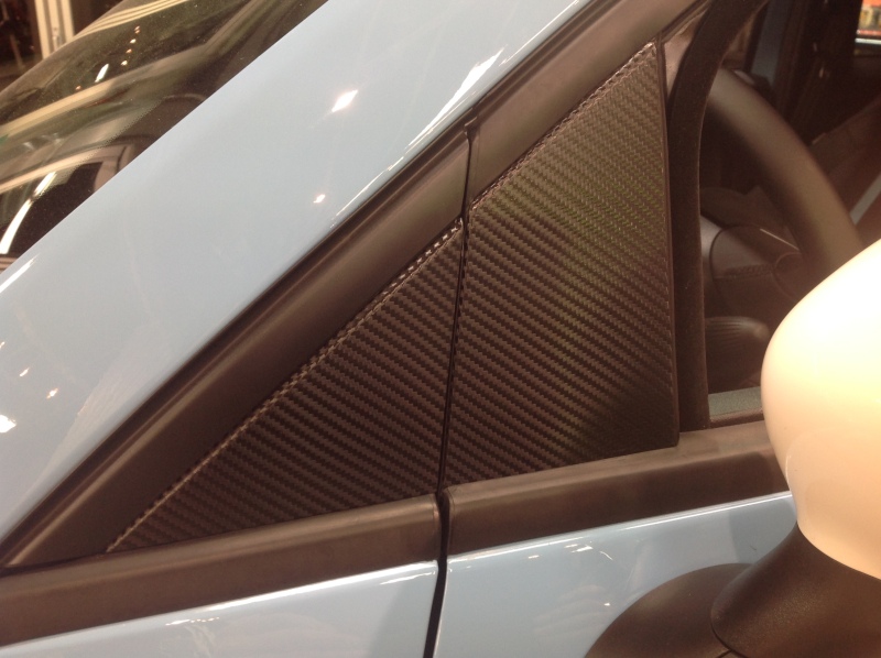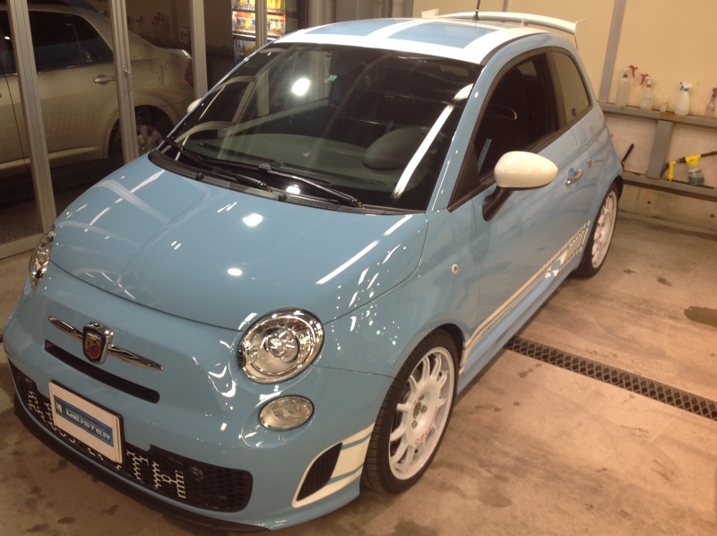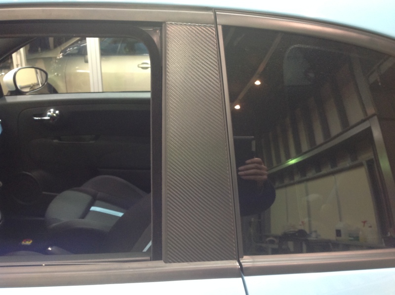 とても珍しいアバルト! ドアの部分にカーボン柄のラッピングを貼りました。おクルマ全体から見れば小さい部分ですが、印象が変わりますよ‼
