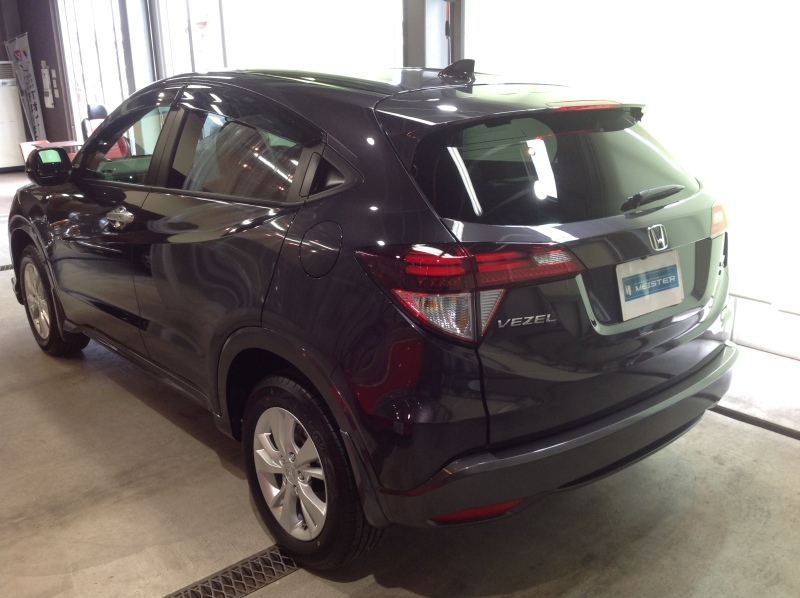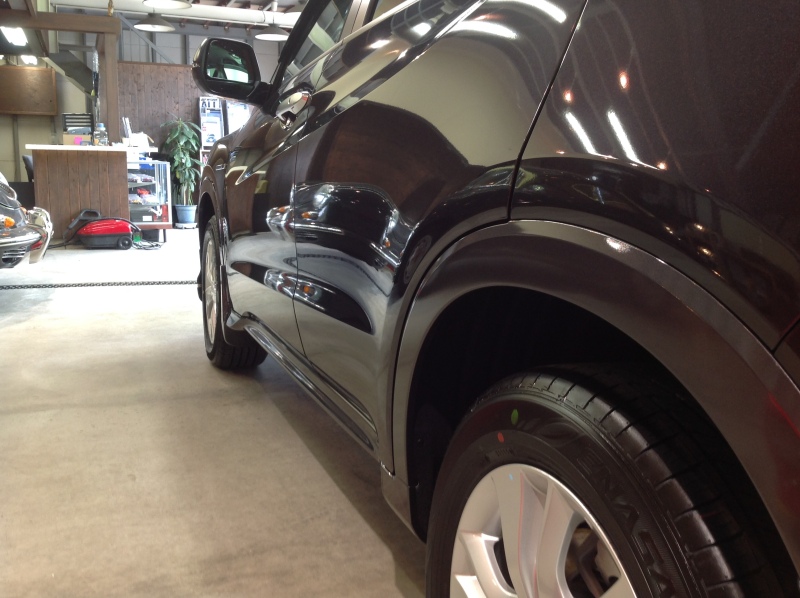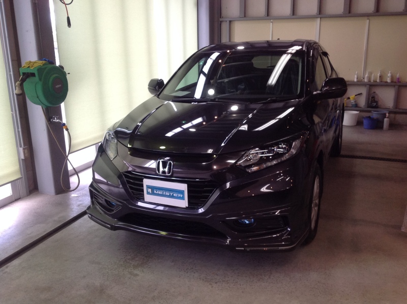 無限のエアロを装着したホンダ ヴェゼルHV。新車ですが花粉がかなり付着していました。洗車しただけでは除去できないので、特殊な方法で完全に除去してからコーティング。花粉はボディに浸食してシミを作りますが、コーティングしておけば、かなり食い止められますよ!